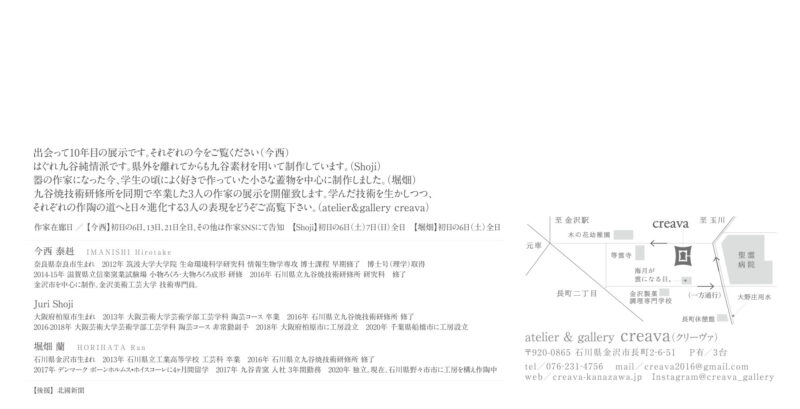 金沢の atelier & gallery creava にて、九谷焼技術研修所の同期3名による展示を開催いたします。