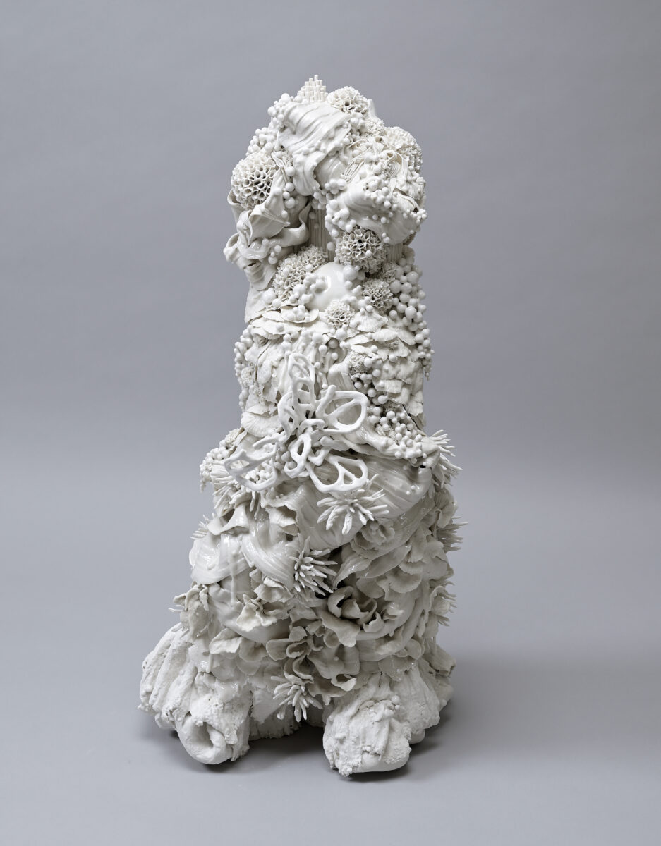 2023年制作、磁土・釉薬・上絵、総貼花技法・手捻り・鋳込み