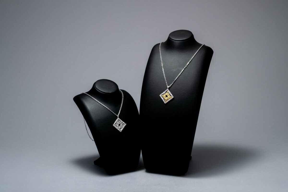 国宝の修復に用いられる縁付金箔と縁付プラチナ箔を手編みレースに貼り、シルバーの彫金フレームと組み合わせました。